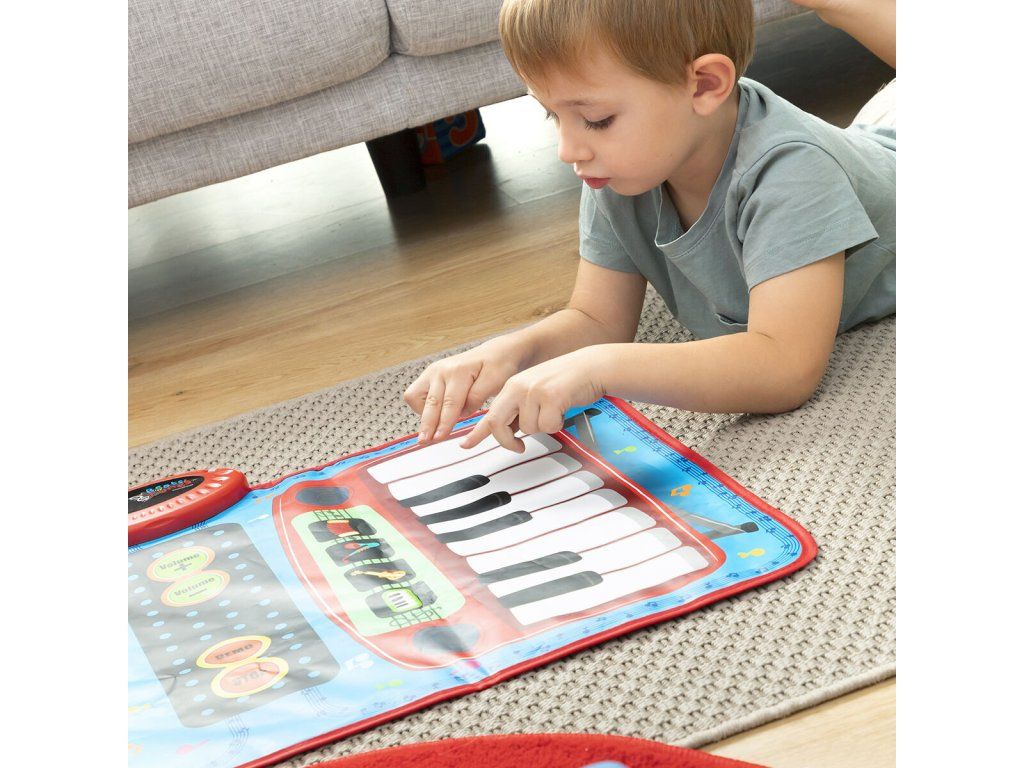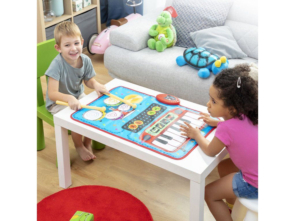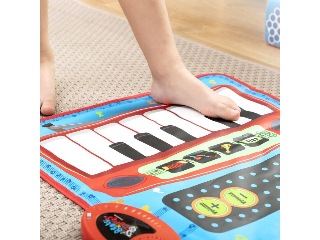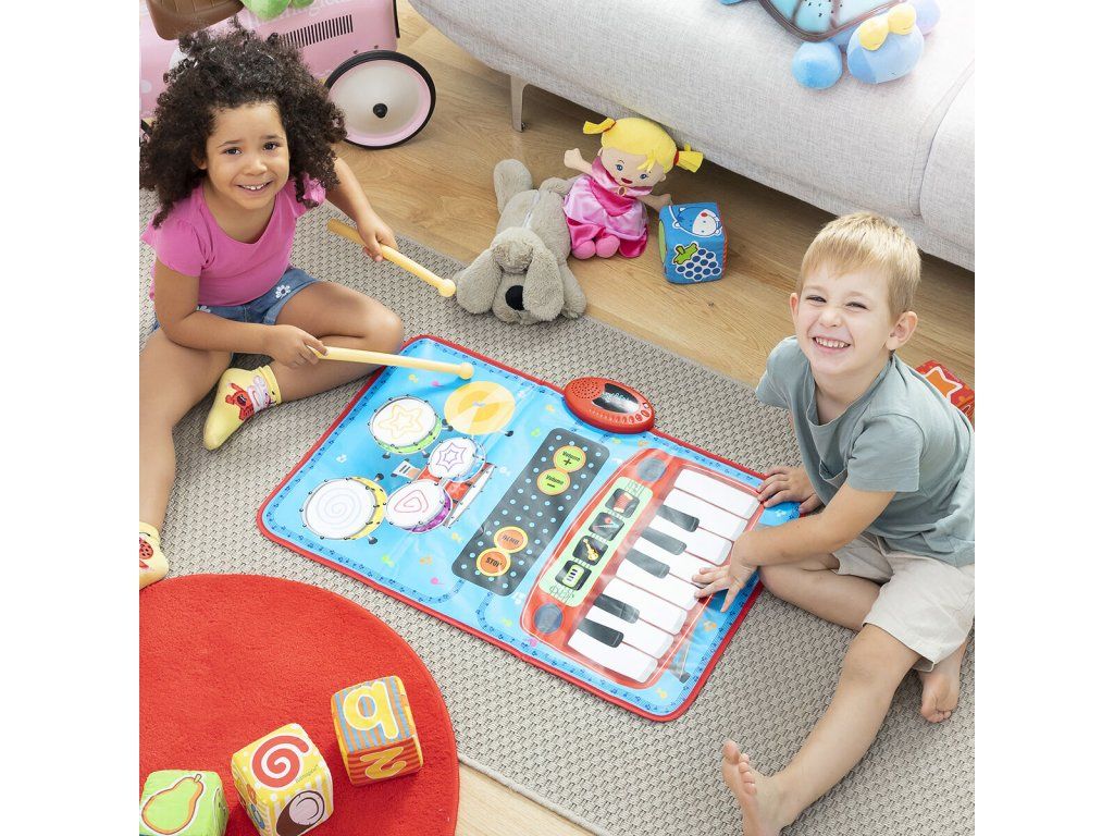 Všestranná hudobná podložka 2 v 1 s originálnym viacfarebným a multifunkčným dizajnom obsahujúca klávesnicu so 4 nástrojmi (klavír, husle, akordeón, saxofón) a súpravu bicích nástrojov s bubnami a činelami. Má tiež voliteľné sprievodné melódie a obsahuje 2 paličky na hranie na bicie. Ideálna pre 2 deti na spoločné hranie, pretože na biciu súpravu a klávesnicu môžete hrať súčasne. Táto hudobná podložka je protišmyková, odolná a veľmi ľahko sa používa. Zapína a vypína sa tlačidlom on/off. Nastavte hlasitosť pomocou 2 tlačidiel hlasitosti (+/-). Automatické sprievodné melódie môžete zapnúť a vypnúť pomocou tlačidiel DEMO/STOP. Môžete ju umiestniť na akýkoľvek povrch (podlaha, stôl atď.) a hrať na nej rukami alebo nohami. Funguje na baterky, je ľahká, prenosná, takže si ju môžete vziať kamkoľvek. Perfektný darček s ktorým sa deti môžu zoznámiť s hudbou zábavným spôsobom. Odporúčame pre deti od 3 rokov.- Materiál: