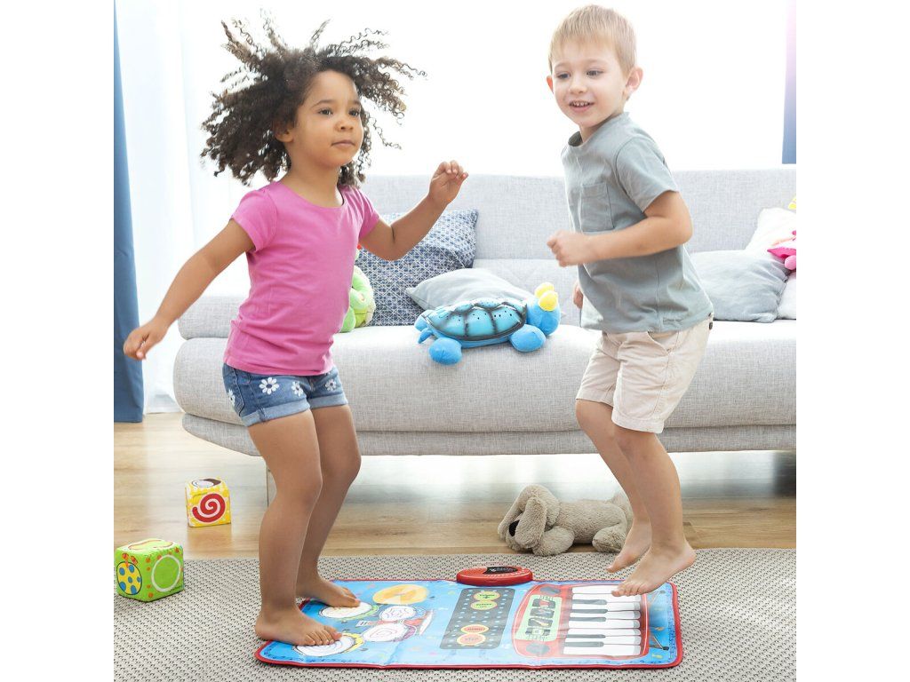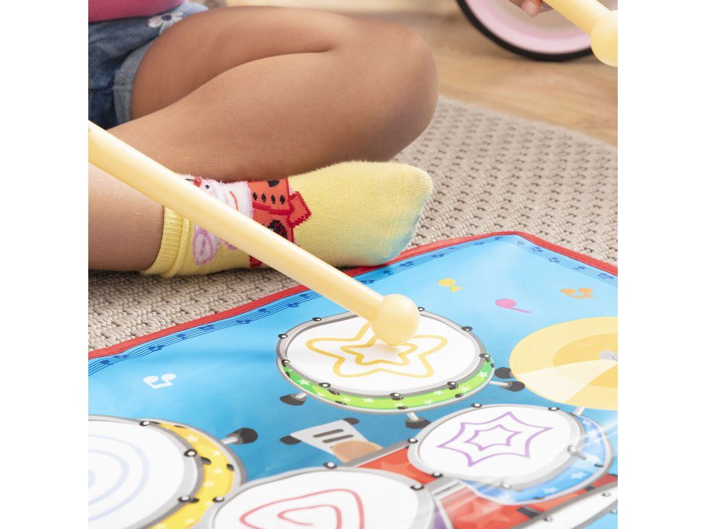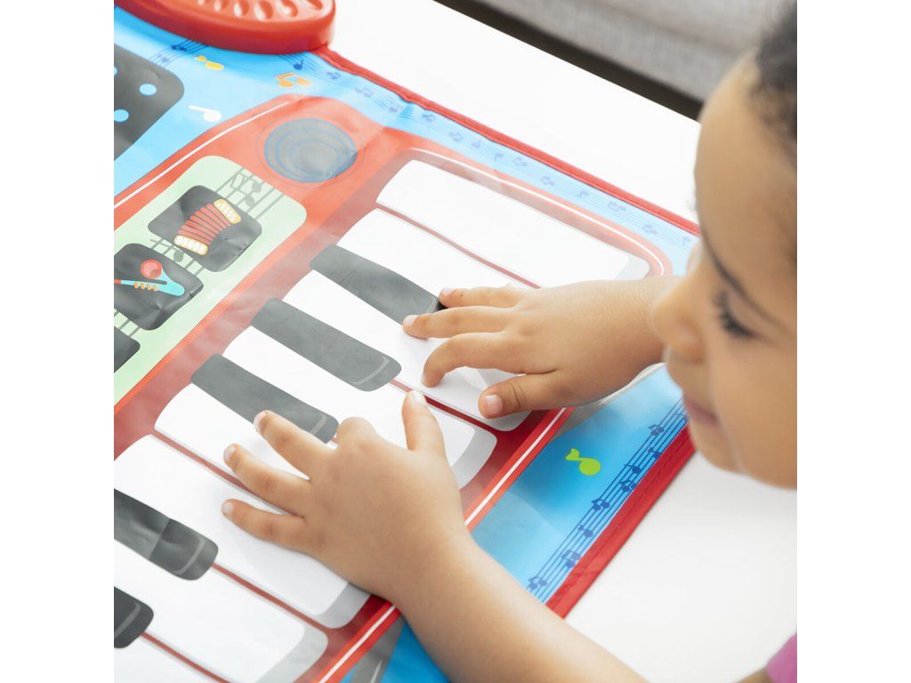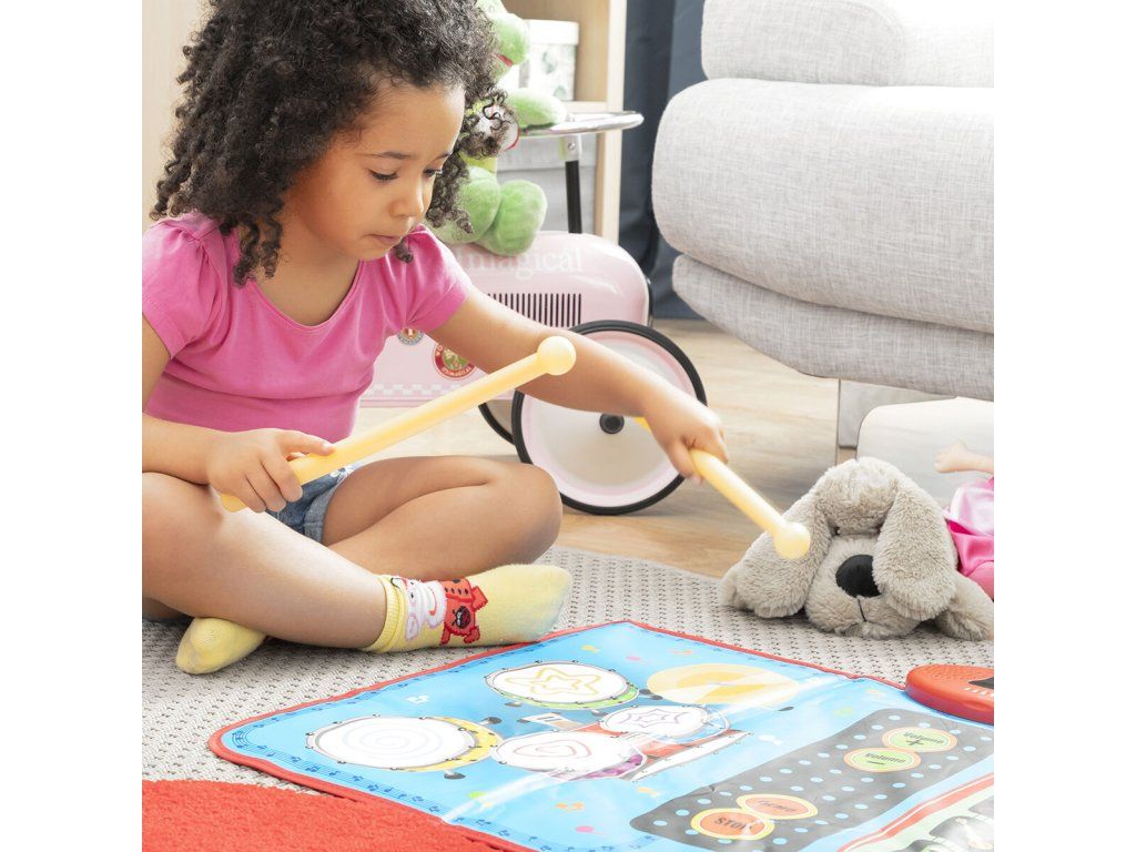 Všestranná hudobná podložka 2 v 1 s originálnym viacfarebným a multifunkčným dizajnom obsahujúca klávesnicu so 4 nástrojmi (klavír, husle, akordeón, saxofón) a súpravu bicích nástrojov s bubnami a činelami. Má tiež voliteľné sprievodné melódie a obsahuje 2 paličky na hranie na bicie. Ideálna pre 2 deti na spoločné hranie, pretože na biciu súpravu a klávesnicu môžete hrať súčasne. Táto hudobná podložka je protišmyková, odolná a veľmi ľahko sa používa. Zapína a vypína sa tlačidlom on/off. Nastavte hlasitosť pomocou 2 tlačidiel hlasitosti (+/-). Automatické sprievodné melódie môžete zapnúť a vypnúť pomocou tlačidiel DEMO/STOP. Môžete ju umiestniť na akýkoľvek povrch (podlaha, stôl atď.) a hrať na nej rukami alebo nohami. Funguje na baterky, je ľahká, prenosná, takže si ju môžete vziať kamkoľvek. Perfektný darček s ktorým sa deti môžu zoznámiť s hudbou zábavným spôsobom. Odporúčame pre deti od 3 rokov.- Materiál: